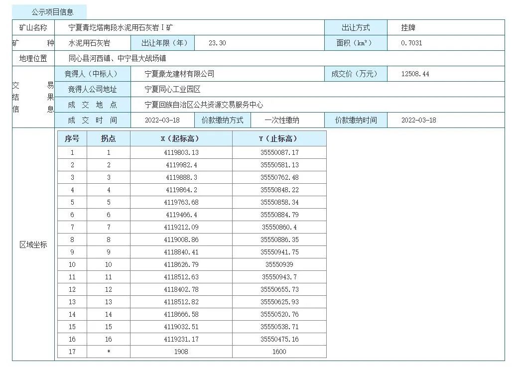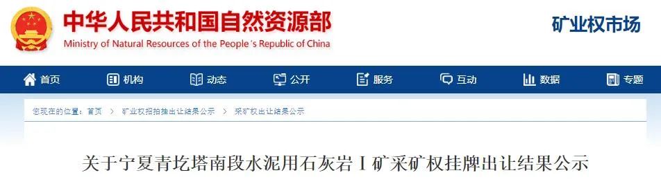 近日,自然資源部發(fā)布了關(guān)于寧夏青圪塔南段水泥用石灰?guī)rⅠ礦采礦權(quán)掛牌出讓結(jié)果公示。中國(guó)水泥網(wǎng)從公示中得知寧夏豪龍建材以1.25億元競(jìng)得了該礦山采礦權(quán)。