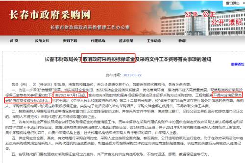長春:自2021年7月1日起,取消政府采購投標保證金。