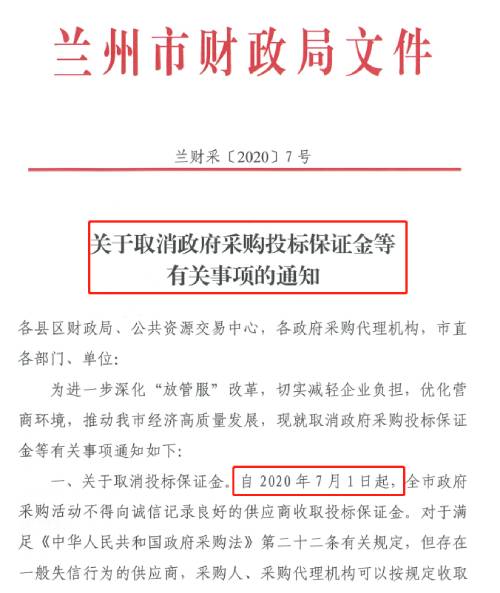 蘭州:自2020年7月1日起,取消政府采購投標保證金。