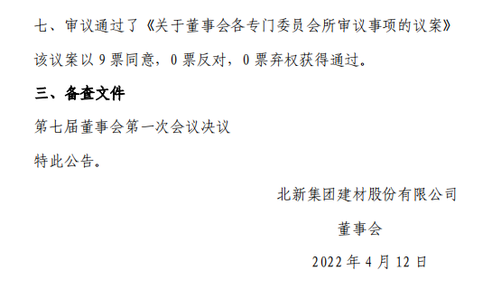 4月12日,北新建材發(fā)布第七屆董事會(huì)第一次會(huì)議決議公告稱(chēng),此次會(huì)議審議通過(guò)了《關(guān)于選舉公司第七屆董事會(huì)董事長(zhǎng)的議案》,同意選舉尹自波先生為公司第七屆董事會(huì)董事長(zhǎng),任期與第七屆董事會(huì)任期一致,自本次會(huì)議決議之日起生效。