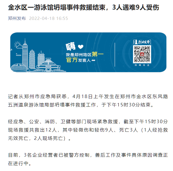 鄭州發(fā)布官微4月18日16:55分消息,4月18日上午發(fā)生在鄭州市金水區(qū)東風(fēng)路五洲溫泉游泳館局部坍塌事件救援工作于下午15時(shí)30分結(jié)束。