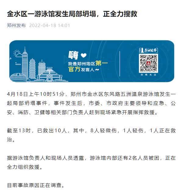 據(jù)鄭州發(fā)布官微18日下午14:01分消息,4月18日上午10時(shí)51分,鄭州市金水區(qū)東風(fēng)路五洲溫泉游泳館發(fā)生一起局部坍塌事件,事件發(fā)生后,市委、市政府主要領(lǐng)導(dǎo)和應(yīng)急、公安、消防、衛(wèi)健等相關(guān)部門負(fù)責(zé)人趕到現(xiàn)場(chǎng)緊急開展指揮救援。截至13時(shí),已救出10人,其中,8人輕微傷,1人輕傷,1人正在救治。據(jù)游泳館負(fù)責(zé)人和現(xiàn)場(chǎng)人員透露,游泳館內(nèi)部還有2名人員被困,正在全力組織救援。