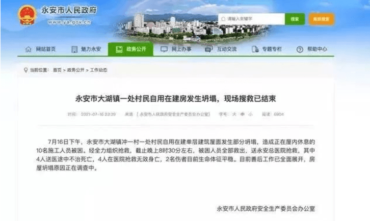 ▲2021年7月16日,福建三明永安市大湖鎮(zhèn)沖一村一處村民自用在建單層建筑屋面發(fā)生部分坍塌,造成正在屋內(nèi)休息的10名施工人員被困。其中4人送醫(yī)途中不治死亡,4人在醫(yī)院搶救無(wú)效身亡。