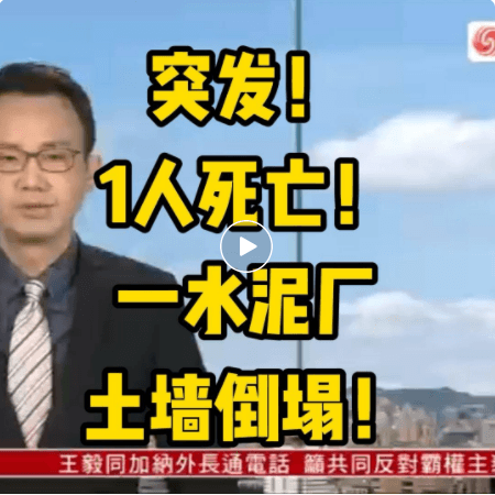 4月19日傍晚,中臺灣臺中市太平區(qū)的一座水泥廠擋土墻突然發(fā)生了坍塌,導(dǎo)致一名泰籍的工人遭到活埋,當(dāng)場死亡,意外的原因有關(guān)單位仍在調(diào)查當(dāng)中。