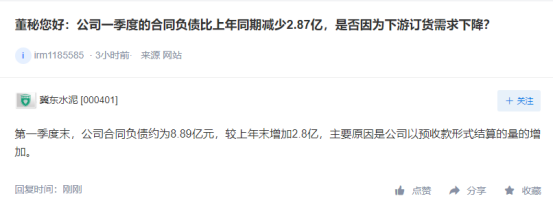 冀東水泥回復(fù):第一季度末,公司合同負債約為8.89億元,較上年末增加2.8億,主要原因是公司以預(yù)收款形式結(jié)算的量的增加。