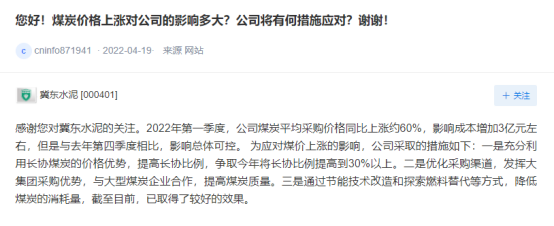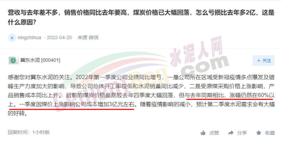 冀東水泥回復(fù):2022年第一季度公司業(yè)績同比增虧,一是公司所在區(qū)域受新冠疫情多點爆發(fā)及錯峰生產(chǎn)力度加大的影響,導(dǎo)致公司總體開工率較低和水泥銷量同比減少;二是受原煤采購價格上漲影響,產(chǎn)品銷售成本同比上升。