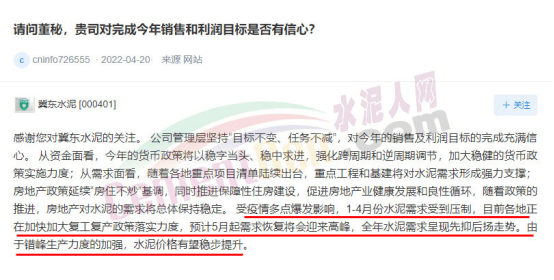 冀東水泥回復(fù):公司管理層堅持“目標(biāo)不變、任務(wù)不減”,對今年的銷售及利潤目標(biāo)的完成充滿信心。