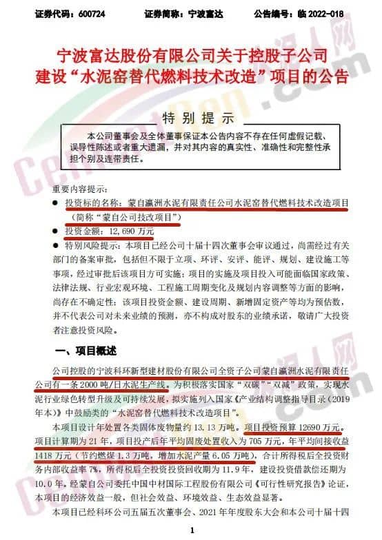 4月21日,寧波富達(dá)股份有限公司發(fā)布公告稱其公司控股的寧波科環(huán)新型建材股份有限公司全資子公司蒙自瀛洲水泥有限責(zé)任公司2000 噸/日水泥生產(chǎn)線,擬實(shí)施列入國家《產(chǎn)業(yè)結(jié)構(gòu)調(diào)整指導(dǎo)目錄(2019年本)》中鼓勵類的“水泥窯替代燃料技術(shù)改造項(xiàng)目”。