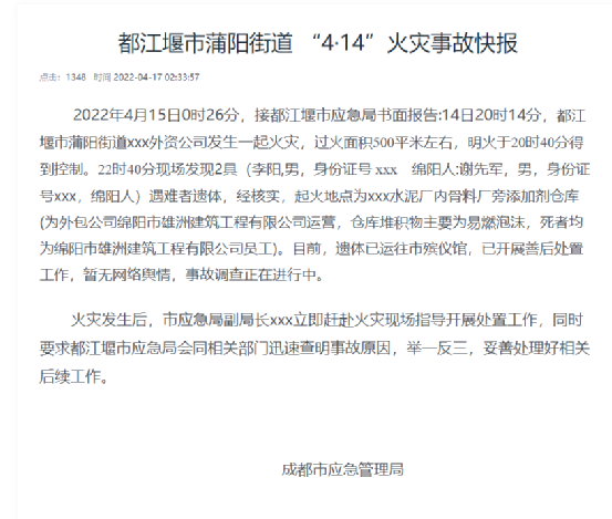 經(jīng)核實(shí),起火地點(diǎn)為水泥廠內(nèi)骨料廠旁添加劑倉(cāng)庫(kù)(為外包公司綿陽(yáng)市雄洲建筑工程有限公司運(yùn)營(yíng),倉(cāng)庫(kù)堆積物主要為易燃泡沫,死者均為綿陽(yáng)市雄洲建筑工程有限公司員工)。遺體已運(yùn)往市殯儀館,已開展善后處置工作,事故調(diào)查正在進(jìn)行中。