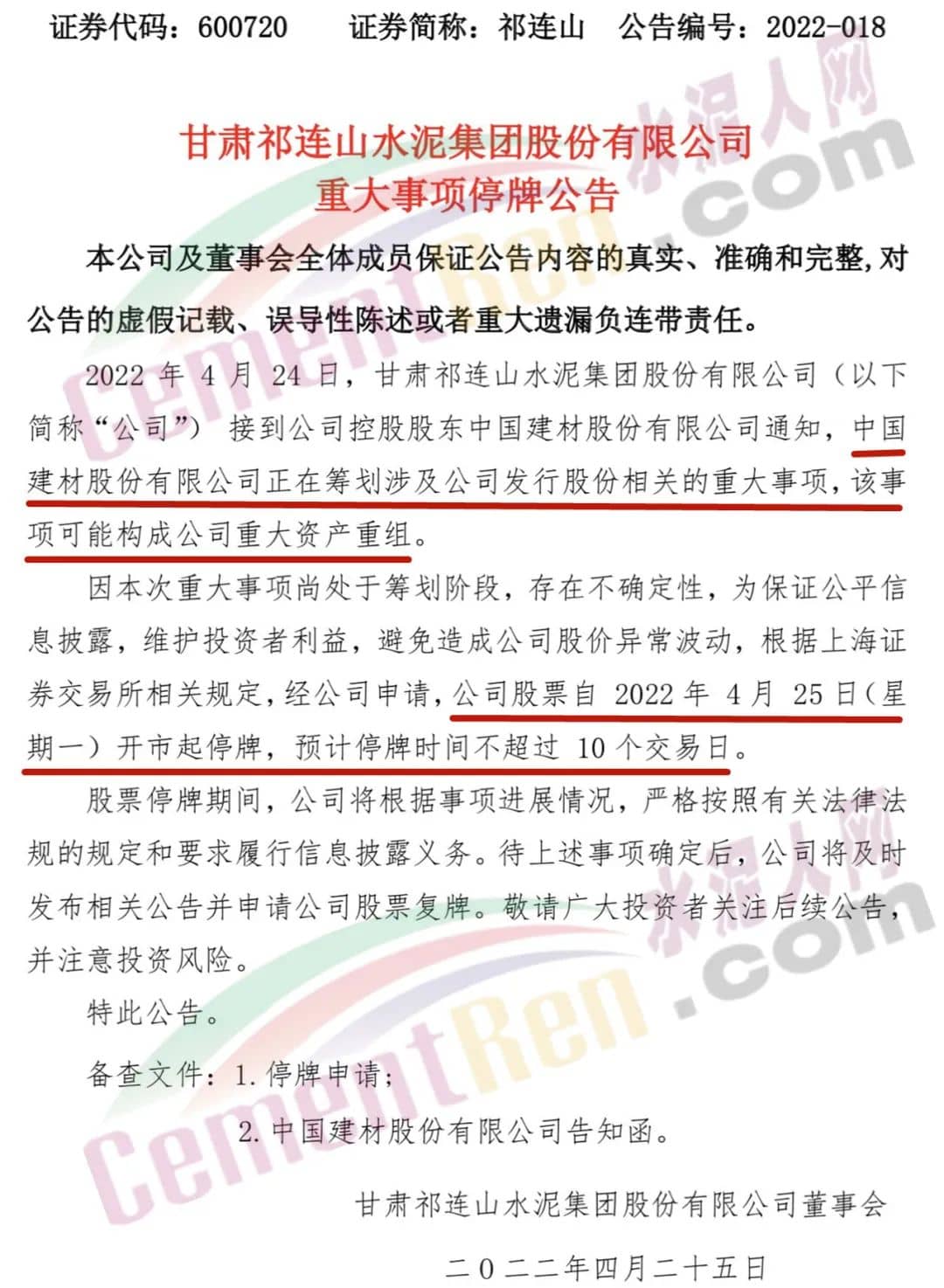 4月25日,甘肅祁連山水泥集團股份有限公司發(fā)布公告稱,中國建材股份有限公司正在籌劃涉及祁連山水泥發(fā)行股份相關(guān)的重大事項,該事項可能構(gòu)成公司重大資產(chǎn)重組。祁連山水泥股票自2022年4月25日開市起停牌,預(yù)計停牌時間不超過10個交易日。