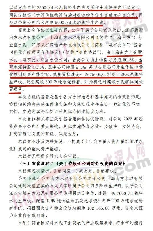 變更后合作協(xié)議主要內(nèi)容:公司下屬子公司宜興天山、江蘇新街南方水泥有限公司、上海南方水泥有限公司(簡(jiǎn)稱“上海南方”)與金墅水泥、江蘇晟宇房地產(chǎn)開發(fā)有限公司(簡(jiǎn)稱“晟宇公司”)簽署《優(yōu)化升級(jí)項(xiàng)目合作協(xié)議》(簡(jiǎn)稱“合作協(xié)議”)。由上海南方與金墅水泥、晟宇公司成立合資公司,合資公司由上海南方持股 50.5%、金墅水泥持股 44.5%、晟宇公司持股占 5%;并以合資公司為主體按市場(chǎng)化原則購(gòu)買產(chǎn)能指標(biāo),減量置換建設(shè)一條 7500t/d 新型干法水泥熟料生產(chǎn)線,配套建設(shè) 300 萬(wàn)噸水泥粉磨,并擇機(jī)適時(shí)建設(shè)水泥窯協(xié)同處置項(xiàng)目。具體公告如下: