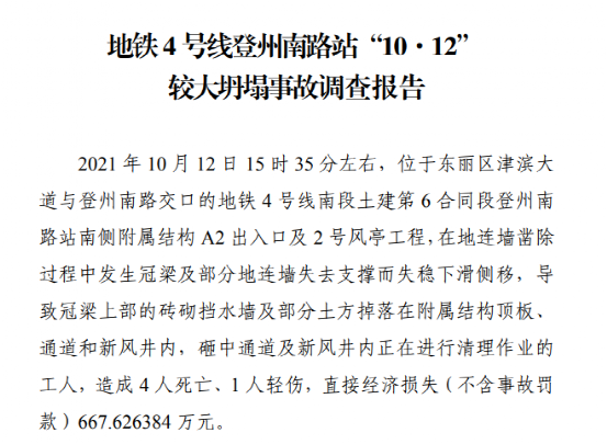 日前,天津市應(yīng)急管理局發(fā)布《地鐵4號(hào)線登州南路站“10·12”較大坍塌事故調(diào)查報(bào)告》提到,2021年10月12日天津地鐵4號(hào)線南段的一處在建工程發(fā)生坍塌導(dǎo)致4人死亡的事故。