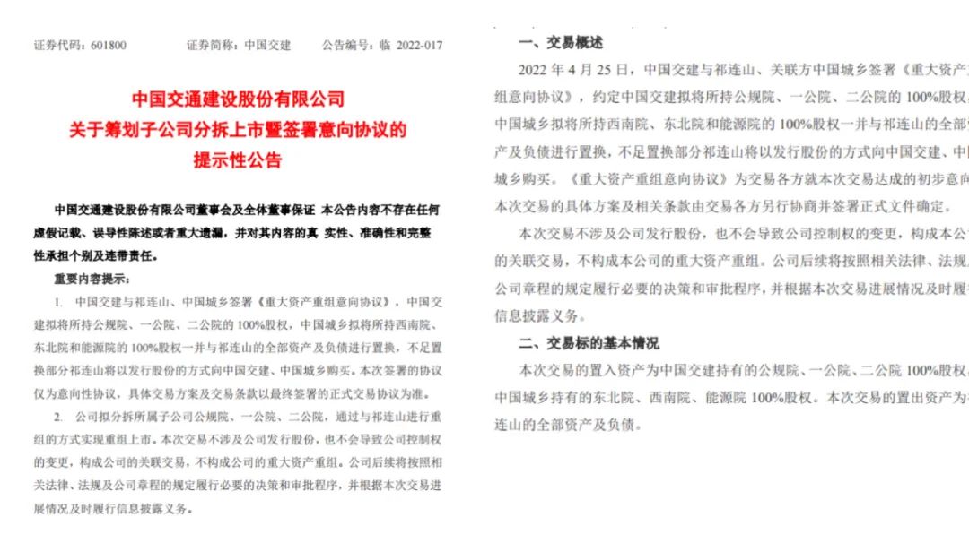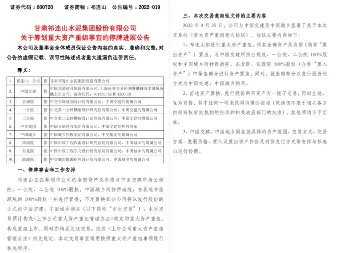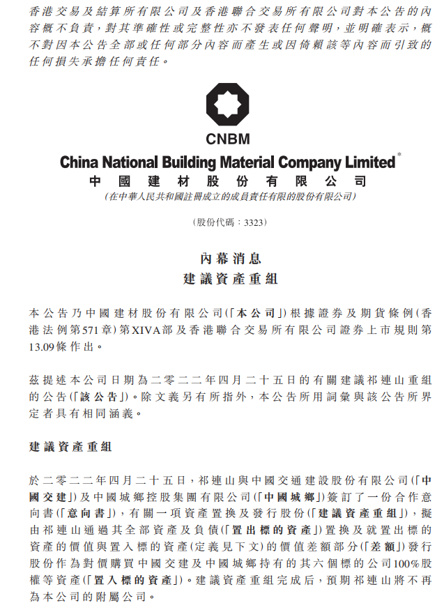 當日中國建材發(fā)布公告稱,于2022年4月25日,祁連山與中國交通建設(shè)股份有限公司及中國城鄉(xiāng)控股集團有限公司簽訂了一份合作意向書,有關(guān)一項資產(chǎn)置換及發(fā)行股份,擬由祁連山通過其全部資產(chǎn)及負債置換及就置出標的資產(chǎn)的價值與置入標的資產(chǎn)的價值差額部分發(fā)行股份作為對價購買中國交建及中國城鄉(xiāng)持有的其六個標的公司100%股權(quán)等資產(chǎn)。建議資產(chǎn)重組完成后,預(yù)期祁連山將不再為公司的附屬公司。