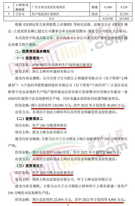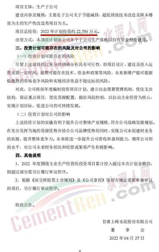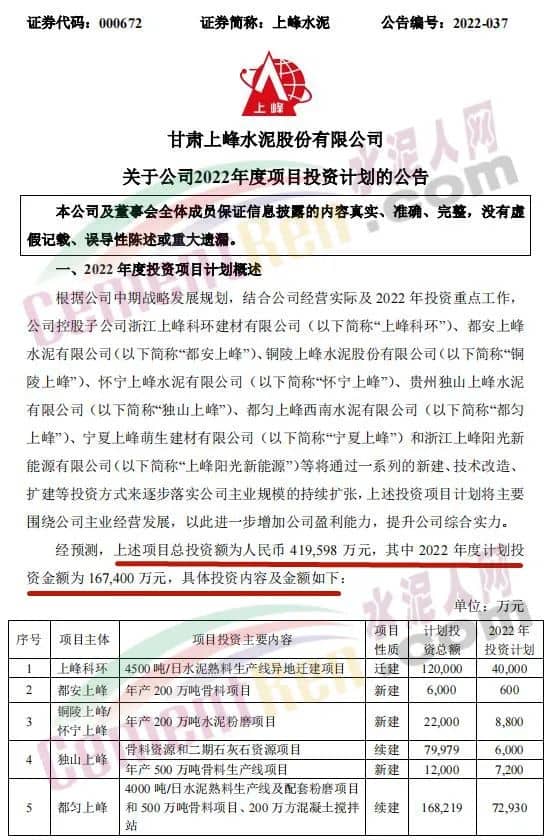 4月27日,甘肅上峰水泥股份有限公司發(fā)布《關(guān)于公司2022年度項目投資計劃的公告》稱,2022年,其控股子公司浙江上峰科環(huán)建材有限公司、都安上峰水泥有限公司、銅陵上峰水泥股份有限公司、懷寧上峰水泥有限公司、貴州獨山上峰水泥有限公司、都勻上峰西南水泥有限公司、寧夏上峰萌生建材有限公司和浙江上峰陽光新能源有限公司等將通過一系列的新建、技術(shù)改造、擴(kuò)建等投資方式來逐步落實公司主業(yè)規(guī)模的持續(xù)擴(kuò)張。