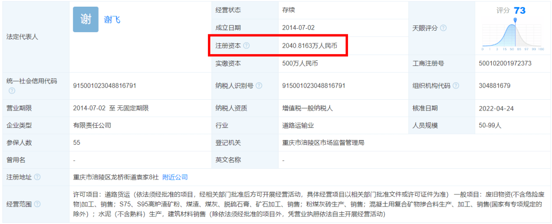 天眼查查詢結(jié)果顯示,重慶市多吉再生資源有限公司,成立于2014-07-02,注冊(cè)資本為2040.8163萬(wàn)人民幣,法定代表人為謝飛,經(jīng)營(yíng)狀態(tài)為存續(xù),工商注冊(cè)號(hào)為500102001972373,注冊(cè)地址為重慶市涪陵區(qū)龍橋街道袁家8社,經(jīng)營(yíng)范圍包括許可項(xiàng)目:道路貨運(yùn)(依法須經(jīng)批準(zhǔn)的項(xiàng)目,經(jīng)相關(guān)部門批準(zhǔn)后方可開(kāi)展經(jīng)營(yíng)活動(dòng),具體經(jīng)營(yíng)項(xiàng)目以相關(guān)部門批準(zhǔn)文件或許可證件為準(zhǔn)) 一般項(xiàng)目:廢舊物資(不含危險(xiǎn)廢物)加工、銷售;S75、S95高爐渣礦粉、煤渣、煤灰、脫硫石膏、礦石加工、銷售;粉煤灰磚生產(chǎn)、銷售;混凝土用復(fù)合礦物摻合料生產(chǎn)、加工、銷售(國(guó)家有專項(xiàng)規(guī)定的除外);水泥(不含熟料)生產(chǎn),建筑材料銷售(除依法須經(jīng)批準(zhǔn)的項(xiàng)目外,憑營(yíng)業(yè)執(zhí)照依法自主開(kāi)展經(jīng)營(yíng)活動(dòng))。