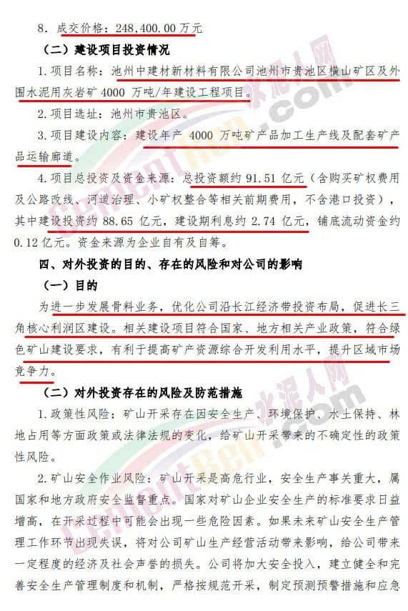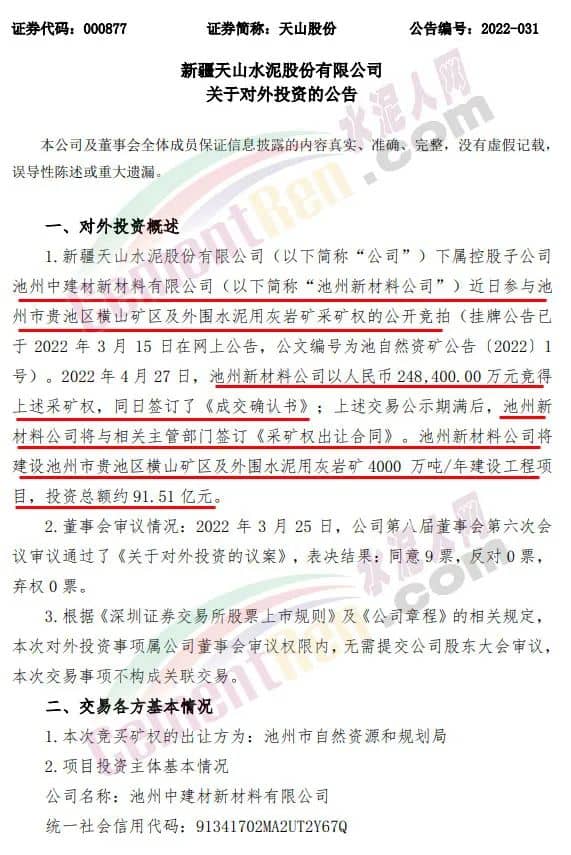 4月27日晚,天山股份公告,控股子公司池州新材料公司以24.84億元競得池州市貴池區(qū)橫山礦區(qū)及外圍水泥用灰?guī)r礦采礦權。待《采礦權出讓合同》簽訂后,池州新材料公司將建設“池州市貴池區(qū)橫山礦區(qū)及外圍水泥用灰?guī)r礦4000萬噸/年建設工程項目”,投資總額約91.51億元,此次投資將增加公司骨料產能。