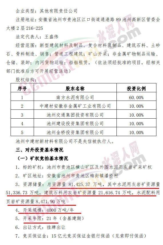 公告顯示,此次標的礦權總資源量約8.14億噸,其中水泥用灰?guī)r礦資源量5.13億噸、建筑石料用灰?guī)r礦資源量2.16億噸、水泥配料用頁巖礦資源量8471.90萬噸,開采規(guī)模為4000萬噸/年,開采年限為21年。