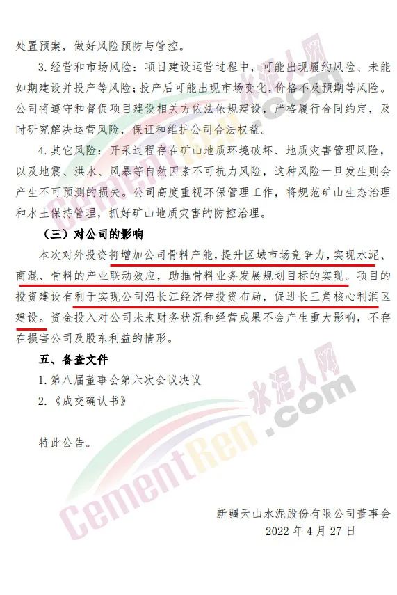“進一步發(fā)展骨料業(yè)務,優(yōu)化公司沿長江經濟帶投資布局,促進長三角核心區(qū)建設。”天山股份如此表示。公告全文如下: