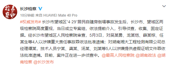 據(jù)湖南省長沙市人民檢察院官方微博消息,長沙居民自建房倒塌事故發(fā)生后,長沙市、望城區(qū)兩級檢察院高度重視,當(dāng)日成立專案組,依法提前介入,引導(dǎo)偵查,收集、固定證據(jù)。