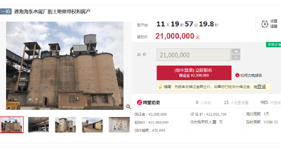 來(lái)自阿里拍賣頻道的信息可見(jiàn),即將開(kāi)始的拍賣項(xiàng)目中涉及三家水泥企業(yè)機(jī)械設(shè)備或房產(chǎn)及土地使用權(quán)等拍賣。值得注意的三條拍賣信息圍觀人數(shù)幾千人,報(bào)名人數(shù)均為“0”。