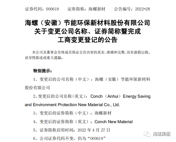 年初以來,在海螺集團(tuán)的指導(dǎo)下,海螺新材積極推進(jìn)名稱及股票簡稱變更具體工作,3月份完成了新名稱工商預(yù)核準(zhǔn),并經(jīng)公司年度董事會(huì)、年度股東大會(huì)審議通過,于4月25日經(jīng)蕪湖市市場監(jiān)督管理局審核登記,領(lǐng)取了新的營業(yè)執(zhí)照。