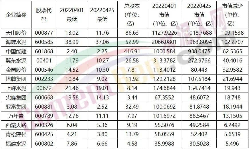 盤點水泥行業(yè)13家上市公司數(shù)據(jù),4月1日至25日期間市值均有減少,其中天山股份市值減少了109.15億,海螺水泥減少了102.27億,均超百億。13家上市公司共蒸發(fā)了456.42億元。