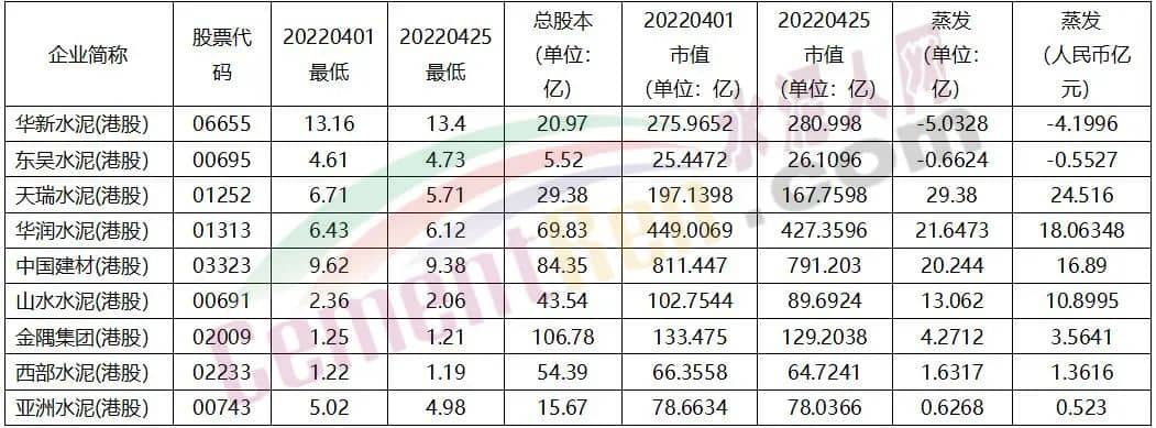 9家港股上市企業(yè)除華新水泥和東吳水泥外,其余7家企業(yè)均4月1日至25日市值也有不同幅度的下滑,其中天瑞水泥市值下滑24.516億元,華潤水泥下滑18.063億元,中國建材下滑16.98億元,山水水泥下滑10.90億元,均超10億元人民幣。上述市值下滑的7家企業(yè)共蒸發(fā)了75.82億元。