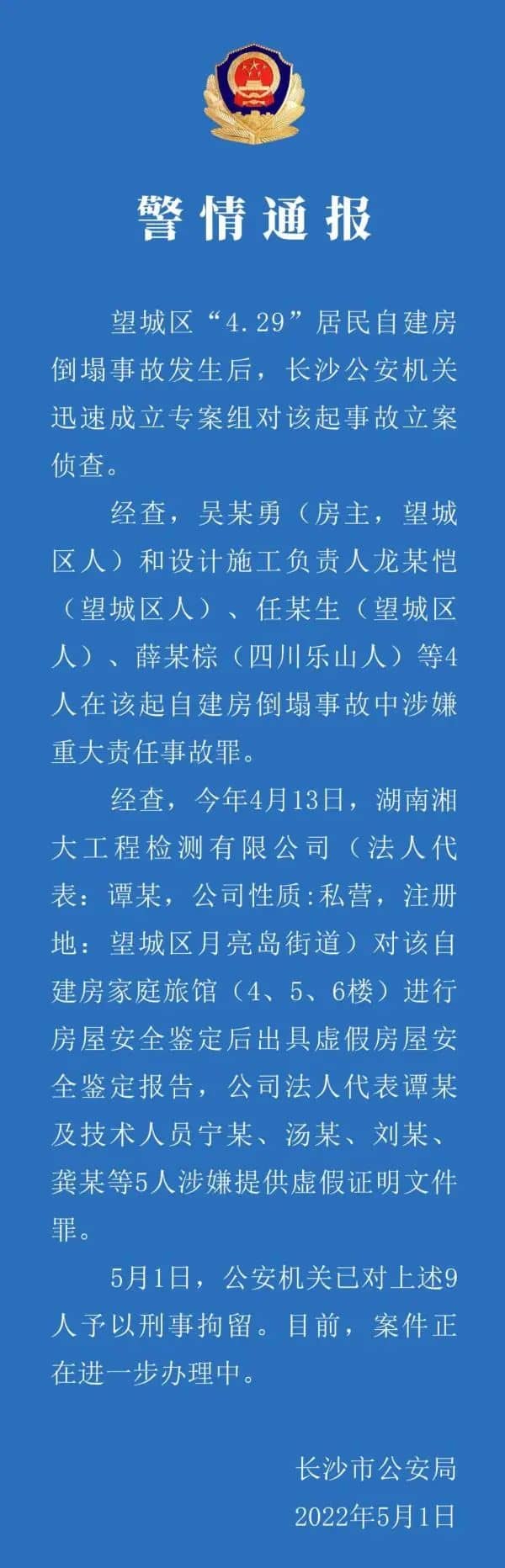 經(jīng)查,今年4月13日,湖南湘大工程檢測有限公司對該自建房家庭旅館(4、5、6樓)進行房屋安全鑒定后出具虛假房屋安全鑒定報告,公司法人代表譚某及技術(shù)人員寧某、湯某、劉某、龔某等5人涉嫌提供虛假證明文件罪。