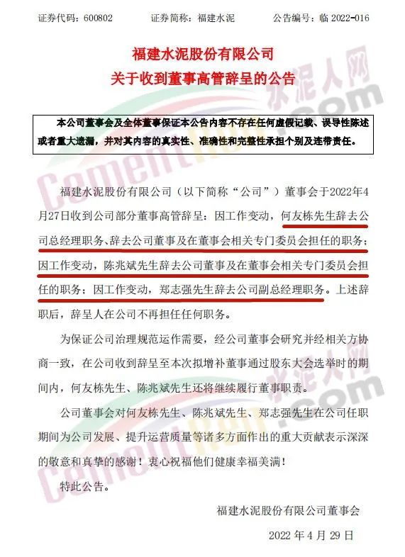同期,福建水泥股份有限公司發(fā)布《關(guān)于收到董事高管辭呈的公告 》稱,因工作變動,何友棟先生辭去公司總經(jīng)理職務(wù)、辭去公司董事及在董事會相關(guān)專門委員會擔(dān)任的職務(wù);因工作變動,陳兆斌先生辭去公司董事及在董事會相關(guān)專門委員會擔(dān)任的職務(wù);因工作變動,鄭志強(qiáng)先生辭去公司副總經(jīng)理職務(wù)。
