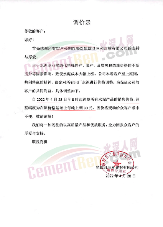 云南永保特種水泥有限責(zé)任公司通知,因各類水泥原材料的緊缺及價格上漲而導(dǎo)致生產(chǎn)成本的上升,故對水泥價格做出調(diào)整以緩解不斷上漲的成本壓力,自2022年4月30日0時起所有區(qū)域所有品種水泥在原價基礎(chǔ)上上調(diào) 30元/噸。