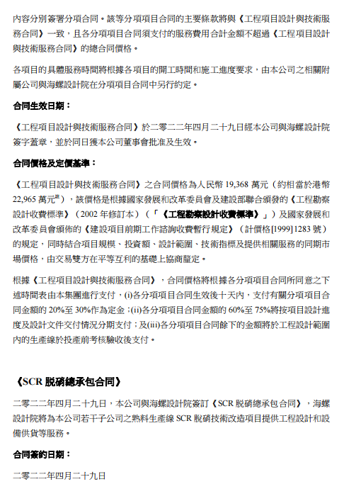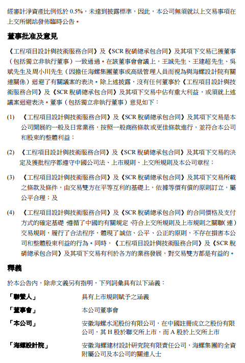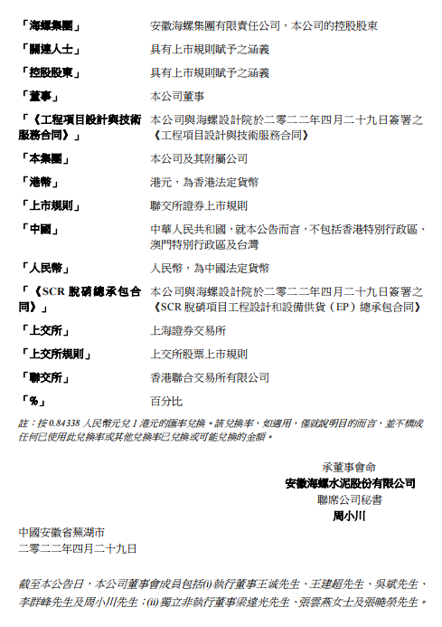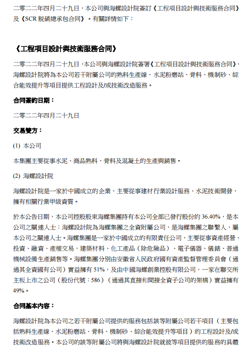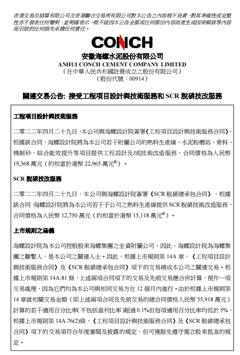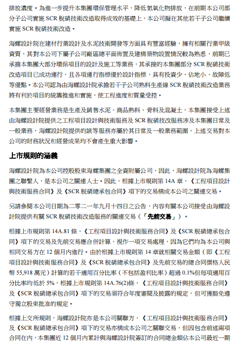 SCR脫硝技改服務(wù),2022年4月29日,本公司與海螺設(shè)計院簽署《SCR脫硝總承包合同》,根據(jù)該合同,海螺設(shè)計院將為本公司若干子公司之熟料生產(chǎn)線提供SCR脫硝技術(shù)改造服務(wù),注合同價格為人民幣12,750萬元(約相當(dāng)于港幣15,118萬元)。