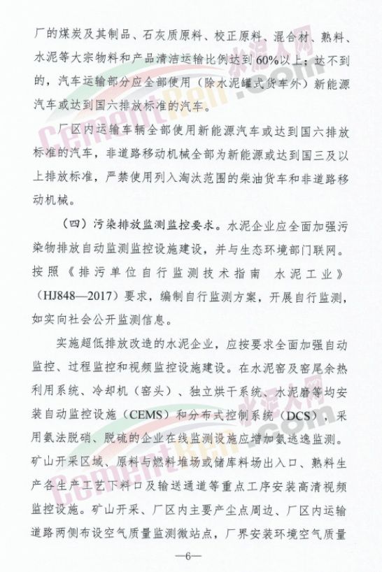 積極推動水泥企業(yè)采用鐵路、水路、管道或帶式輸送機(jī)等清潔方式運(yùn)輸,進(jìn)出廠的煤炭及其制品、石灰質(zhì)原料、校正原料、混合材、熟料、水泥等大宗物料和產(chǎn)品清潔運(yùn)輸比例達(dá)到60%以上;達(dá)不到的,汽車運(yùn)輸部分應(yīng)全部使用(除水泥罐式貨車外)新能源汽車或達(dá)到國六排放標(biāo)準(zhǔn)的汽車。
