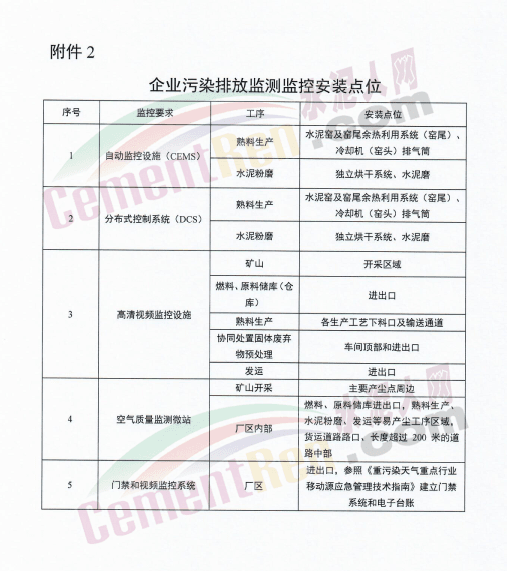 實施超低排放改造的水泥企業(yè),應(yīng)按要求全面加強(qiáng)自動監(jiān)控、過程監(jiān)控和視頻監(jiān)控設(shè)施建設(shè)。在水泥窯及窯尾余熱利用系統(tǒng)、冷卻機(jī)(窯頭)、獨(dú)立烘干系統(tǒng)、水泥磨等均安裝自動監(jiān)控設(shè)施(CEMS)和分布式控制系統(tǒng)(DCS),采用氨法脫硝、脫硫的企業(yè)在線監(jiān)測設(shè)施應(yīng)增加氨逃逸監(jiān)測。