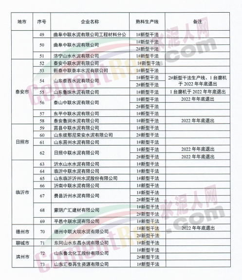 山東泉興水泥有限公司兩條新型干法水泥熟料生產(chǎn)線退出時間標(biāo)注為“待定”。