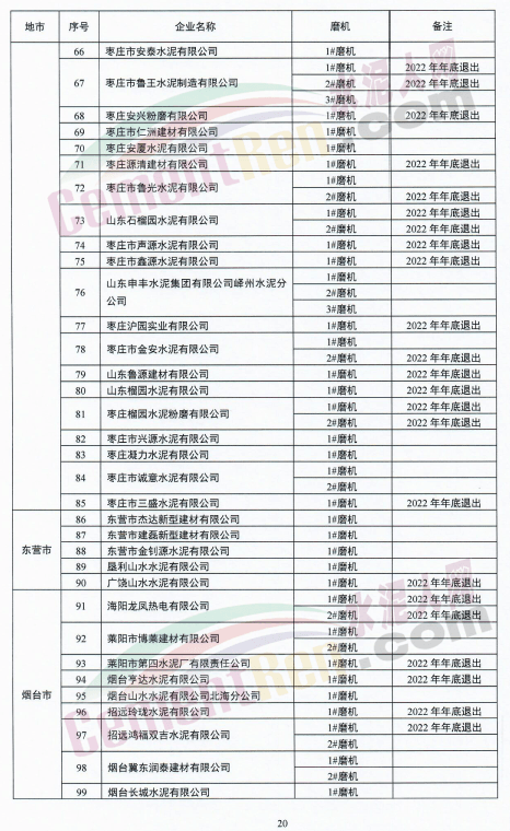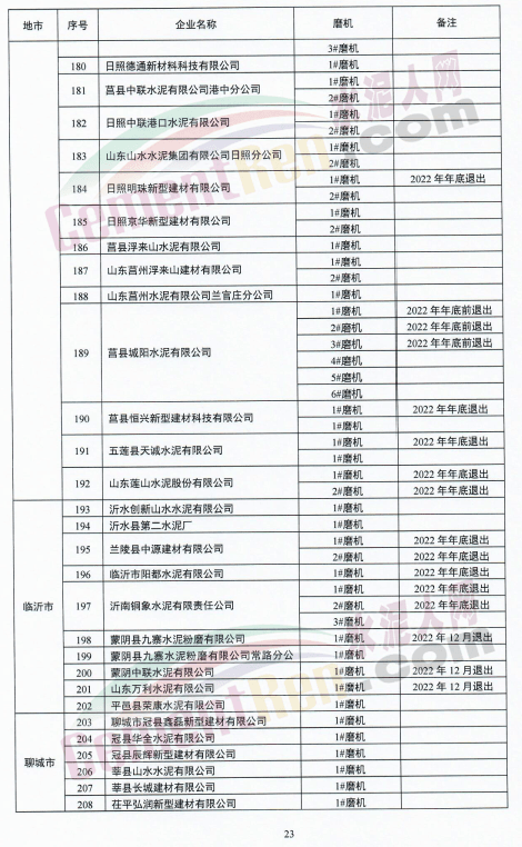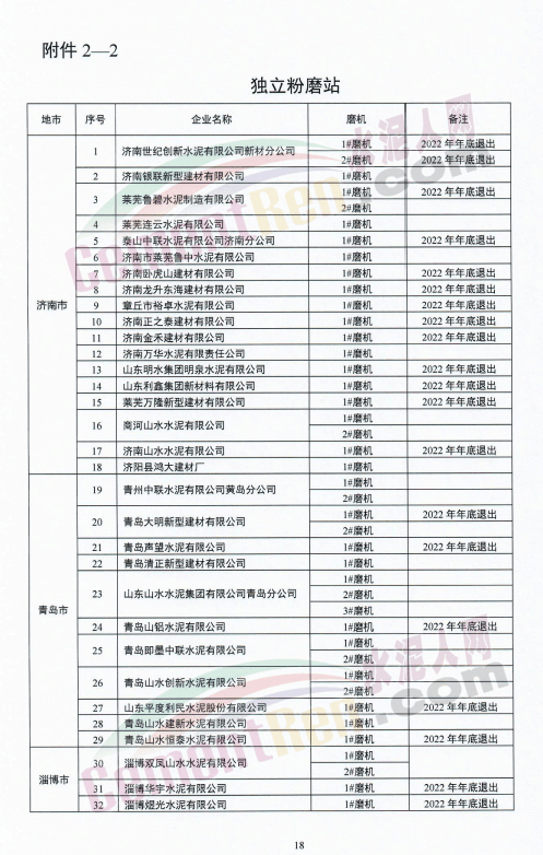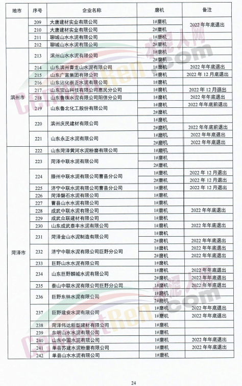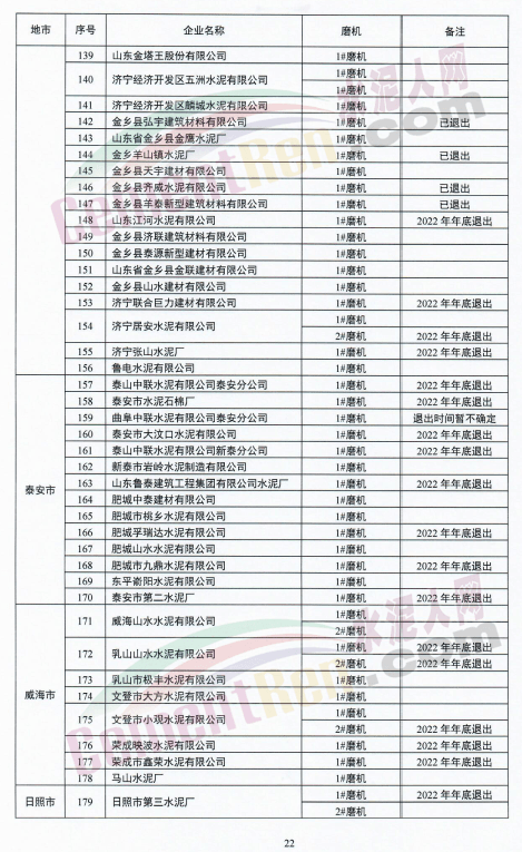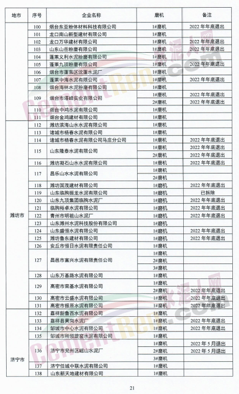 單體粉磨站標(biāo)注為“退出”或“拆除”的共164臺磨機(jī),其中今年底前退出的共156臺,5月份退出的2臺。已退出的4臺磨機(jī)。山東臨朐振龍水泥有限公司1#磨機(jī)標(biāo)注為“已拆除”。曲阜中聯(lián)水泥有限公司泰安分公司l#磨機(jī)標(biāo)注為“退出時間暫不確定”。