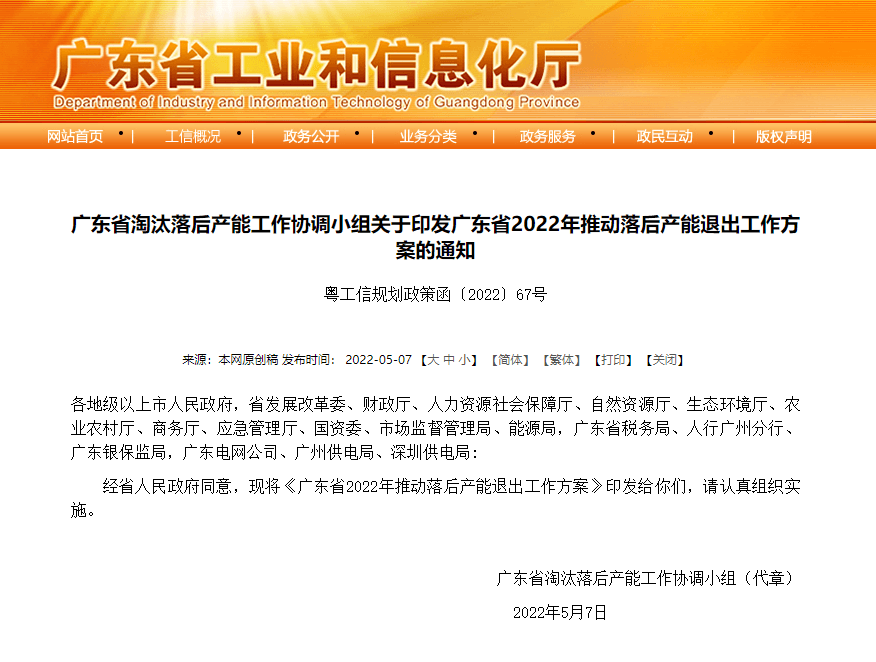 廣東省2022年推動(dòng)落后產(chǎn)能退出工作方案