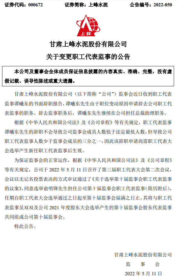 上峰水泥5月11日晚間發(fā)布公告稱,譚曦東先生由于職位變動原因申請辭去公司職工代表監(jiān)事的職務(wù)。