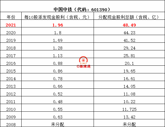 中國(guó)中鐵擬向全體股東每10股派送現(xiàn)金紅利人民幣1.96元(含稅),以2022年3月30日中國(guó)中鐵總股本24741653683股為基數(shù)計(jì)算,合計(jì)擬派發(fā)現(xiàn)金紅利48.49億元(含稅);占當(dāng)年合并報(bào)表歸屬于上市公司股東凈利潤(rùn)的17.5%。