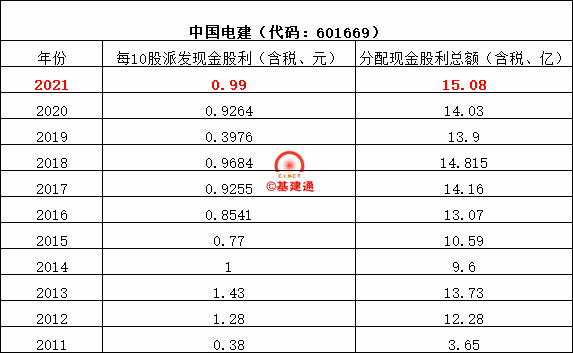 中國(guó)電建2021年度以期末總股本15299035024股,扣除回購(gòu)專(zhuān)戶股份152999901股為基數(shù),向全體股東每10股派發(fā)現(xiàn)金紅利0.9957元(含稅),共計(jì)分配現(xiàn)金股利15.08億元,占本年度末母公司可供股東分配利潤(rùn)的28.57%,占本年度合并會(huì)計(jì)報(bào)表歸屬于上市公司普通股股東凈利潤(rùn)的20%。