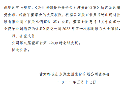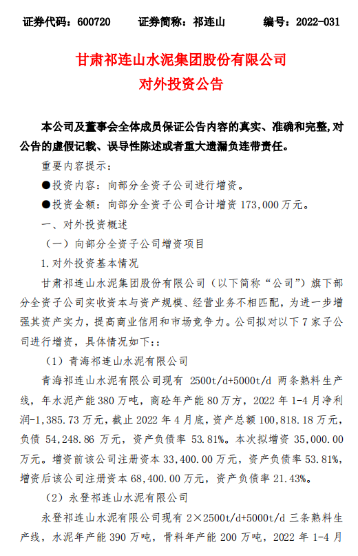 公司擬對7家子公司進行增資,分別為青海祁連山水泥有限公司、永登祁連山水泥有限公司、成縣祁連山水泥有限公司、古浪祁連山水泥有限公司、漳縣祁連山水泥有限公司、甘谷祁連山水泥有限公司、甘肅祁連山水泥集團有限公司(以該公司成功設立為前提)。向上述全資子公司合計增資17.3億元。公告原文如下: