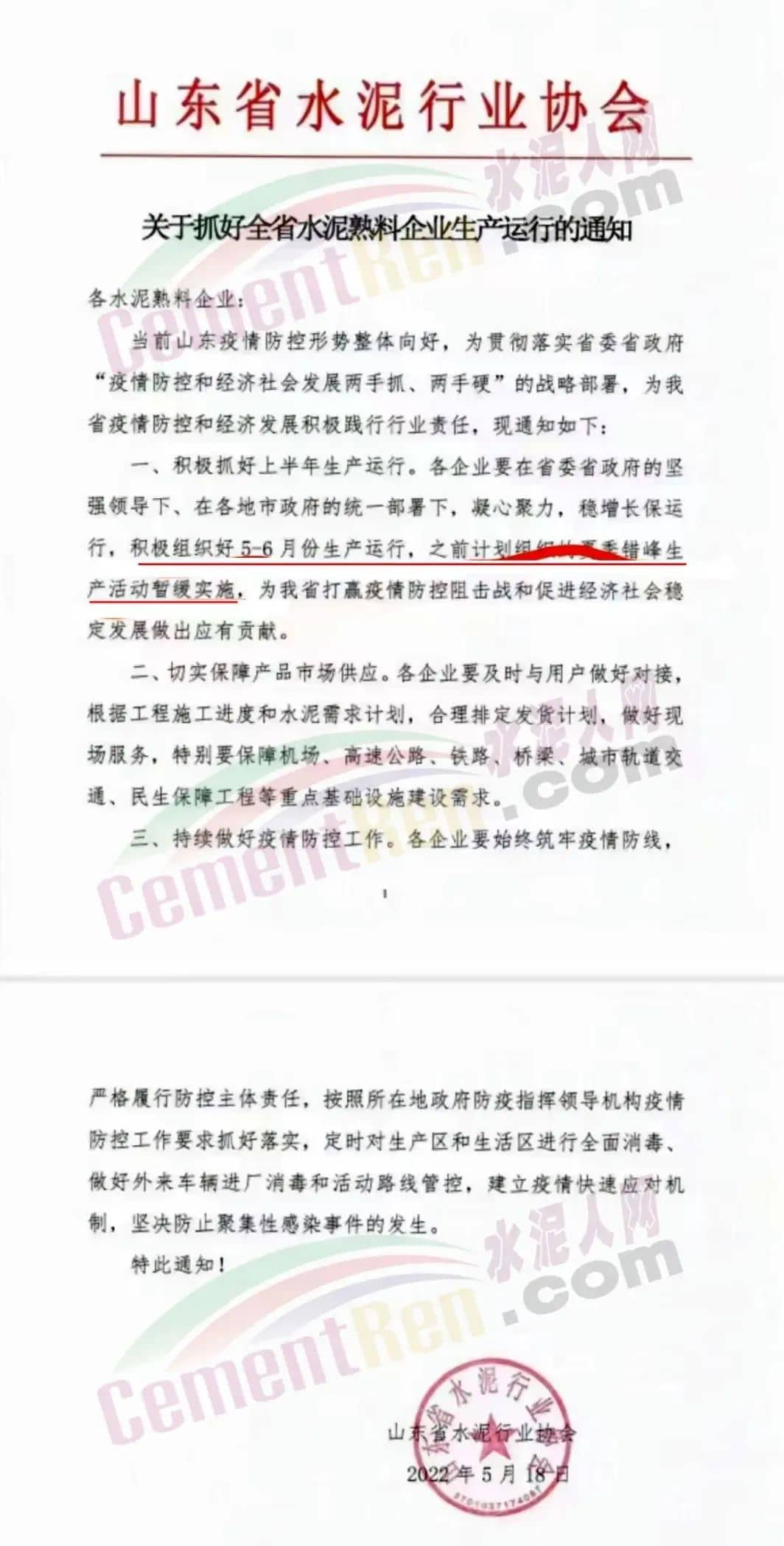 5月18日,山東省水泥行業(yè)協(xié)會(huì)發(fā)布《關(guān)于抓好全省水泥熟料企業(yè)生產(chǎn)運(yùn)行的通知》稱, 為積極抓好上半年生產(chǎn)運(yùn)行。各企業(yè)要在省委省政府的堅(jiān)強(qiáng)領(lǐng)導(dǎo)下、在各地市政府的統(tǒng)一部署下,凝心聚力,穩(wěn)增長(zhǎng)保運(yùn)行,積極組織好5-6月份生產(chǎn)運(yùn)行,之前計(jì)劃組織的夏季錯(cuò)峰生產(chǎn)活動(dòng)暫緩實(shí)施,為山東省打贏疫情防控阻擊戰(zhàn)和促進(jìn)經(jīng)濟(jì)社會(huì)穩(wěn)定發(fā)展做出應(yīng)有貢獻(xiàn)。
