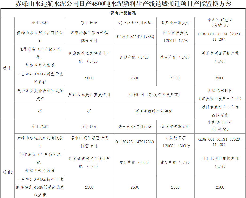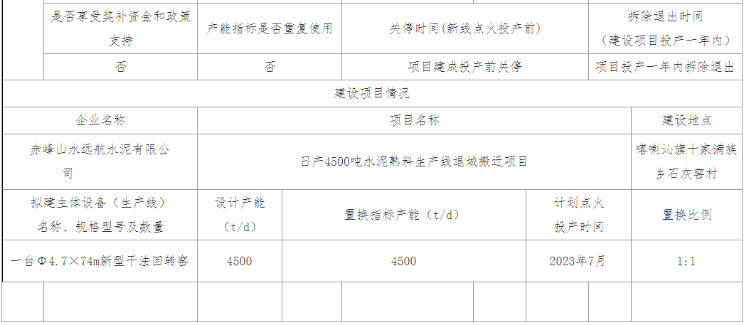 據(jù)了解,2021年3月內(nèi)蒙古工信廳發(fā)布關(guān)于赤峰山水遠(yuǎn)航水泥有限公司日產(chǎn)4500噸水泥熟料生產(chǎn)線退城搬遷項目產(chǎn)能置換方案的公示,內(nèi)容顯示,赤峰山水遠(yuǎn)航水泥有限公司擬整合現(xiàn)有1條日產(chǎn)2500噸干法窯水泥生產(chǎn)線、1條日產(chǎn)2000噸干法窯水泥生產(chǎn)線,等量置換在喀喇沁旗十家滿族鄉(xiāng)石灰窯村建設(shè)1條日產(chǎn)4500噸水泥熟料生產(chǎn)線。項目計劃于2023年7月點火投產(chǎn)。