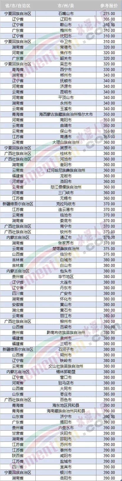 據(jù)水泥人網(wǎng)信息中心數(shù)據(jù),盡管多區(qū)域主要品牌企業(yè)報(bào)價(jià)大幅拉抬,但落地執(zhí)行價(jià)格仍相對較低,近期報(bào)價(jià)在400元/噸以下的區(qū)域包括寧夏、遼寧、廣東、河南、湖南、青海、云南、江蘇、福建、內(nèi)蒙、山西、四川、貴州、湖北、安徽、甘肅 、陜西等近二十個(gè)省份、自治區(qū)。寧夏石嘴山賽馬水泥P.O42.5散裝水泥參考報(bào)價(jià)已降至300元/噸以下,報(bào)275元/噸。