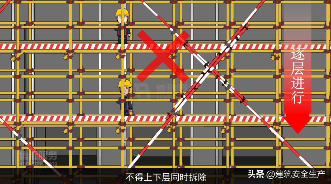 1)架體拆除應(yīng)自上而下逐層進行,不得上下層同時進行。
