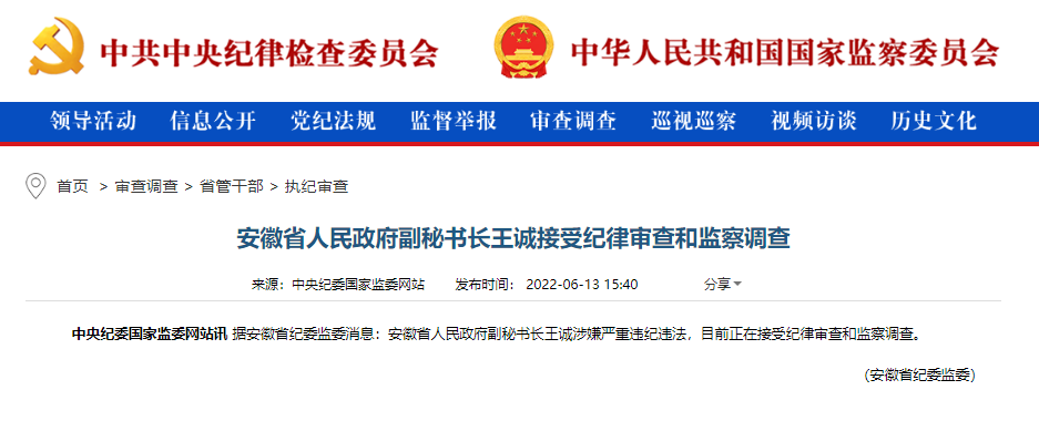 此番安徽省紀(jì)委監(jiān)委發(fā)布的消息顯示,王誠(chéng)是在調(diào)任安徽省政府副秘書(shū)長(zhǎng)后被查。