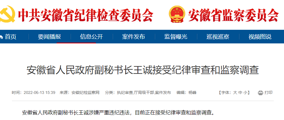 據(jù)安徽省紀(jì)委監(jiān)委消息:安徽省人民政府副秘書(shū)長(zhǎng)王誠(chéng)涉嫌嚴(yán)重違紀(jì)違法,目前正在接受紀(jì)律審查和監(jiān)察調(diào)查。