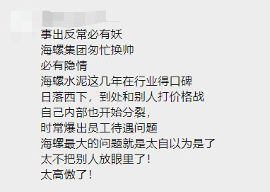 王誠(chéng)辭職時(shí),就曾有網(wǎng)友表示,“作為世界500強(qiáng),一般不會(huì)如此輕率換帥(接任不足一年),其中必有故事。”也有網(wǎng)友表示:“事出反常必有妖,海螺集團(tuán)匆忙換帥必有隱情。”另有網(wǎng)友表示,“第一反應(yīng),腐敗了”。