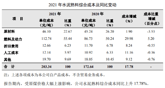 以海螺水泥為例,2021年燃料及動力成本占55.44%,原材料占比22.67%,折舊占比6.23%,人工成本及其它占比5.97%。報告期內(nèi),受原煤價格大幅上漲影響,公司水泥熟料綜合成本同比上升 17.78%。