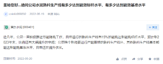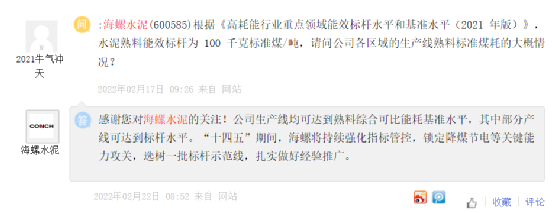 冀東水泥回復投資者時稱,近幾年,公司一直積極推進節(jié)能降耗工作,目前運行的熟料生產(chǎn)線有15%的能耗達到能耗標桿水平,預計到2023年末,比例還有大幅提升的空間;公司除個別將要進行產(chǎn)能置換的熟料生產(chǎn)線外,其他熟料生產(chǎn)線基本都能達到能耗基準水平,目前還在提升優(yōu)化。