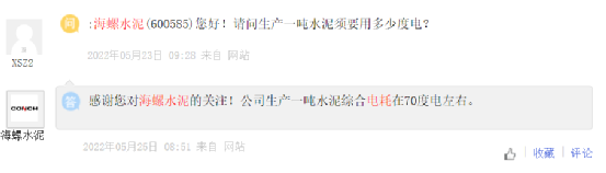海螺水泥此前在回復投資者問題時曾表示公司生產(chǎn)線均可達到熟料綜合可比能耗基準水平,其中部分產(chǎn)線可達到標桿水平,公司生產(chǎn)一噸水泥綜合電耗在70度電左右。(熟料單位產(chǎn)品綜合能耗標桿水平為100千克標準煤/噸;基準水平為117千克標準煤/噸。)
